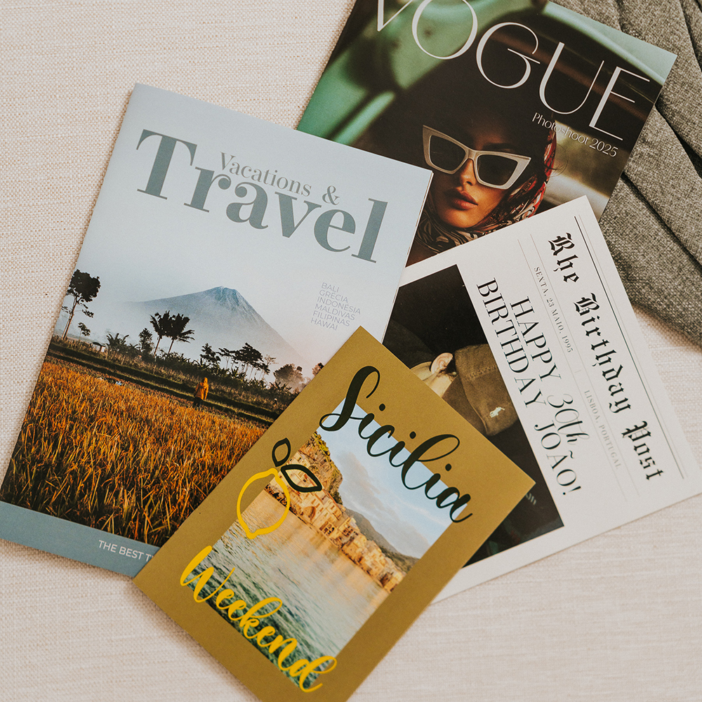 Podes criar a tua revista personalizada para eventos como casamentos, batizados, festas temáticas ou até para oferecer como presente original em datas especiais. É uma excelente ideia de decoração e também uma forma única de partilhar o teu álbum com amigos e família – seja em papel ou nas redes sociais.
