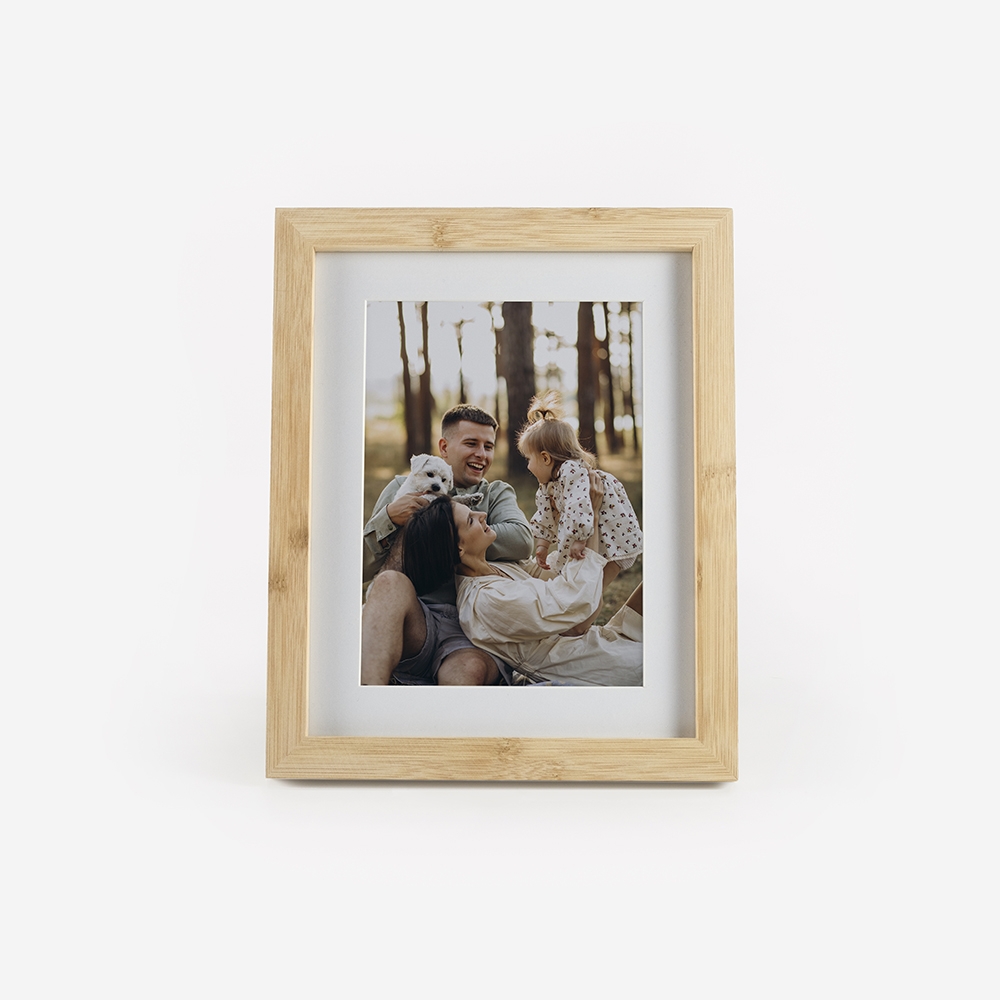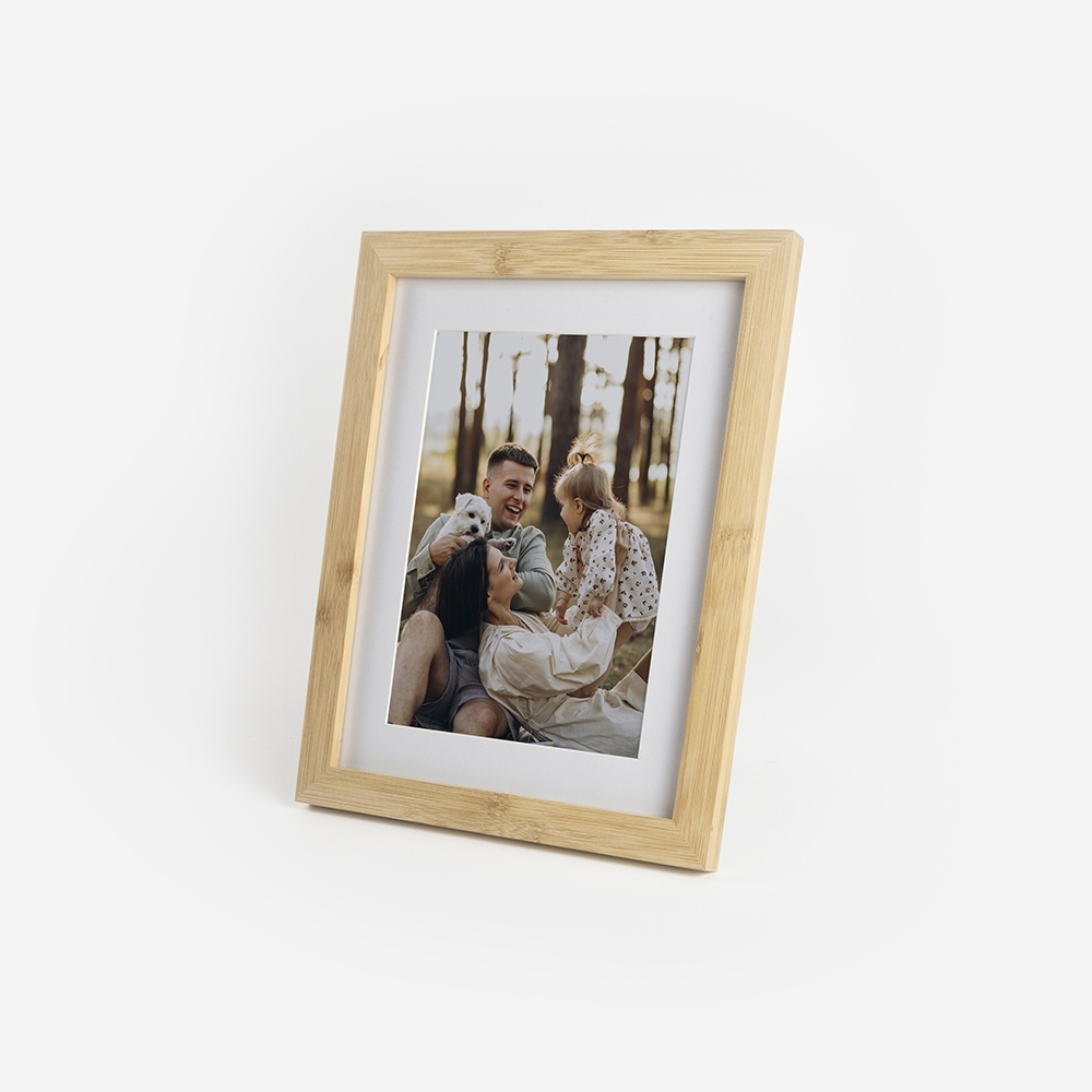 Moldura de alta qualidade, fabricada em madeira 100% Bamboo, garantindo durabilidade e um acabamento perfeito para destacar as tuas fotos.